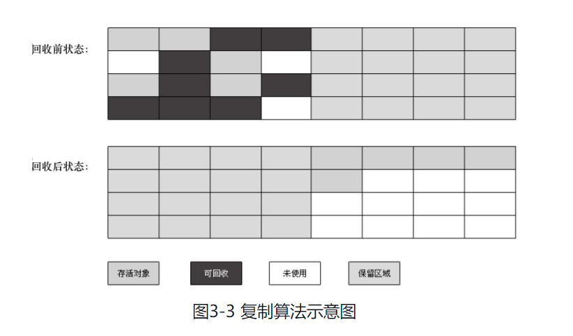 新生代中,每次垃圾收集时都发现有大批对象死去,只有少量存活,那就选用复制算法,只需要付出少量存活对象的复制成本就可以完成收集。