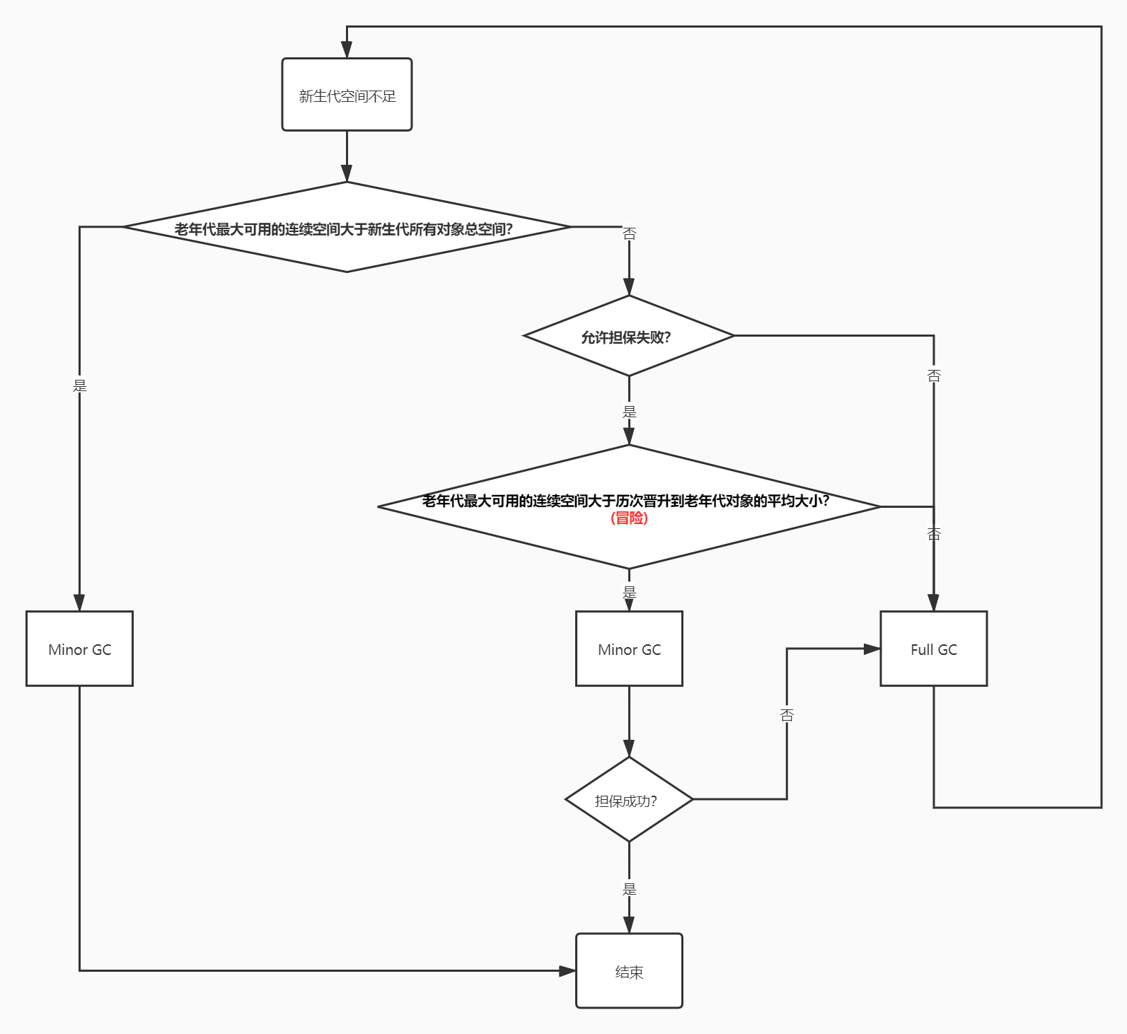 在发生Minor GC之前,虚拟机会先检查老年代最大可用的连续空间是否大于新生代所有对象总空间,如果这个条件成立,那么Minor GC可以确保是安全的。如果不成立,则虚拟机会查看HandlePromotionFailure设置值是否允许担保失败。如果允许,那么会继续检查老年代最大可用的连续空间是否大于历次晋升到老年代对象的平均大小,如果大于,将尝试着进行一次MinorGC,尽管这次Minor GC是有风险的;如果小于,或者HandlePromotionFailure设置不允许冒险,那这时也要改为进行一次Full GC。