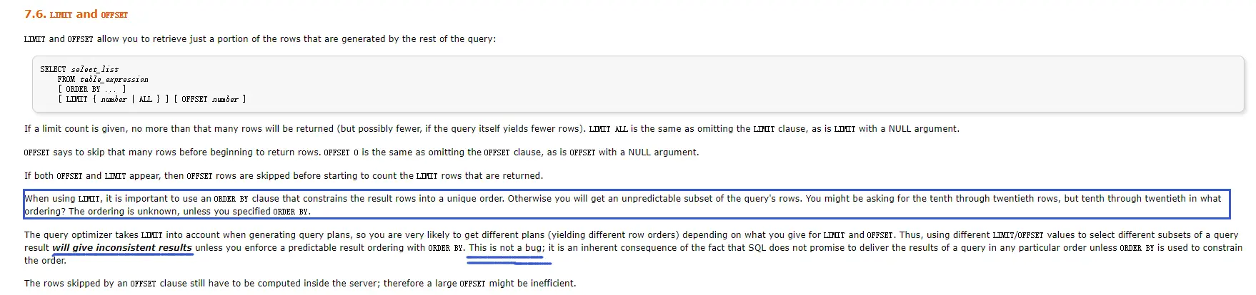 为什么PostgreSQL使用LIMIT关键字进行查询时,返回的结果是乱序的? 楚天行 2020-07-28 1,046 阅读1分钟 记录一次开发过程中遇到的问题,当时在使用PostgreSQL数据进行数据列表查询,但是加了LIMIT之后,不知为何,每次查询返回的结果都不一致。 然后各种搜索资料均无果,后来在PgSql官方文档中找到了相关的解释。如下图 在此特意提醒各位同学,在使用PgSql中LIMIT关键字进行查询的时候,一定要加上order by,否则会出现不可预知的查询结果