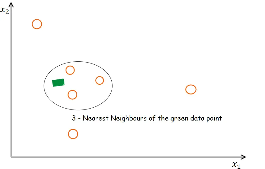 考虑一下上面表示kNN工作的图。在本例中,椭圆形区域表示绿色方形数据点的相邻点。我们用距离来确定邻居。