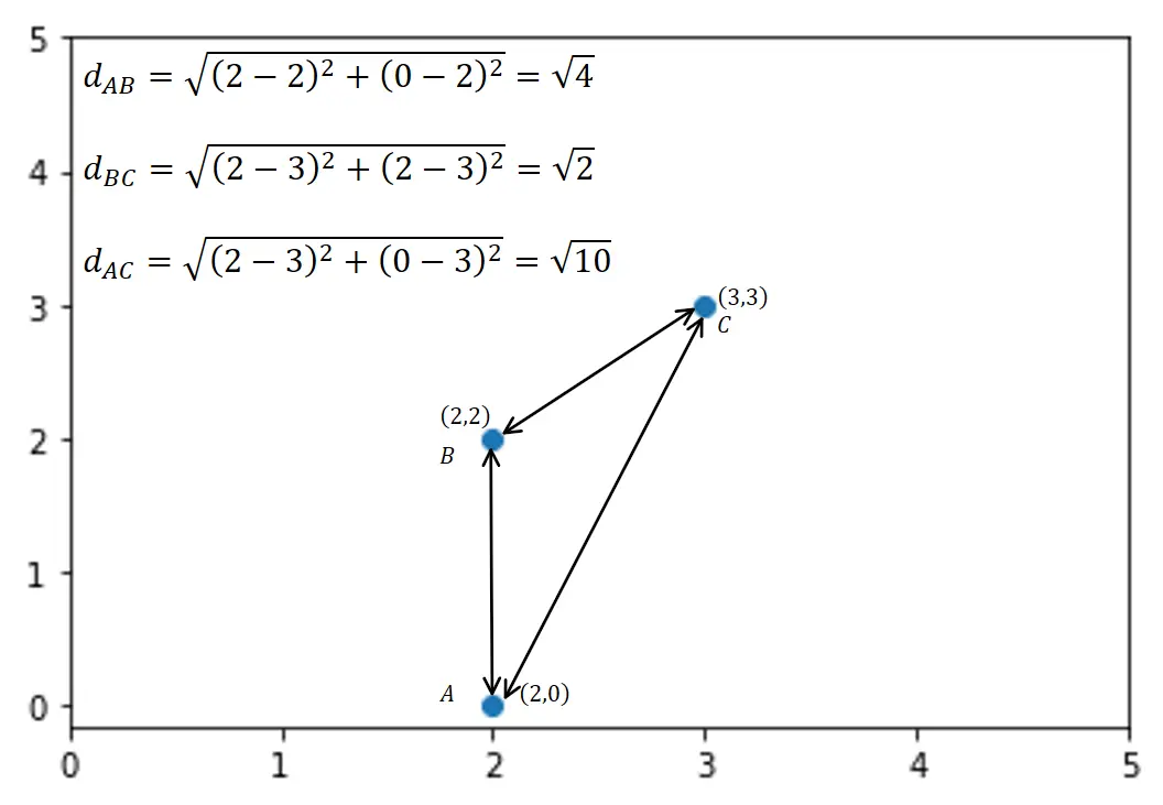 基于欧氏距离的最短距离点被认为是最近邻点。例如,点A的1最近邻点是点B。对于点B,1最近邻点是点C。