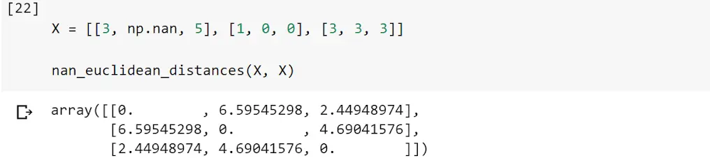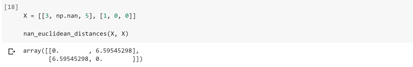 现在我们使用sklearn包pairwise metric模块中的nan_euclidean_distances 函数来计算缺失值两点之间的距离。