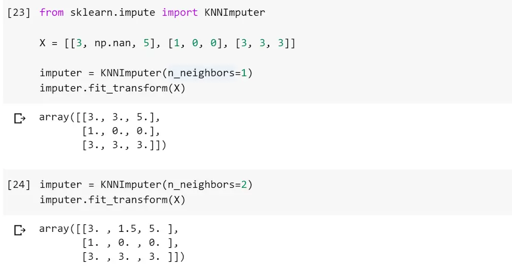 我们将使用sklearn的impute 模块中的KNNImputer 函数。KNNImputer通过欧几里德距离矩阵寻找最近邻,帮助估算观测中出现的缺失值。