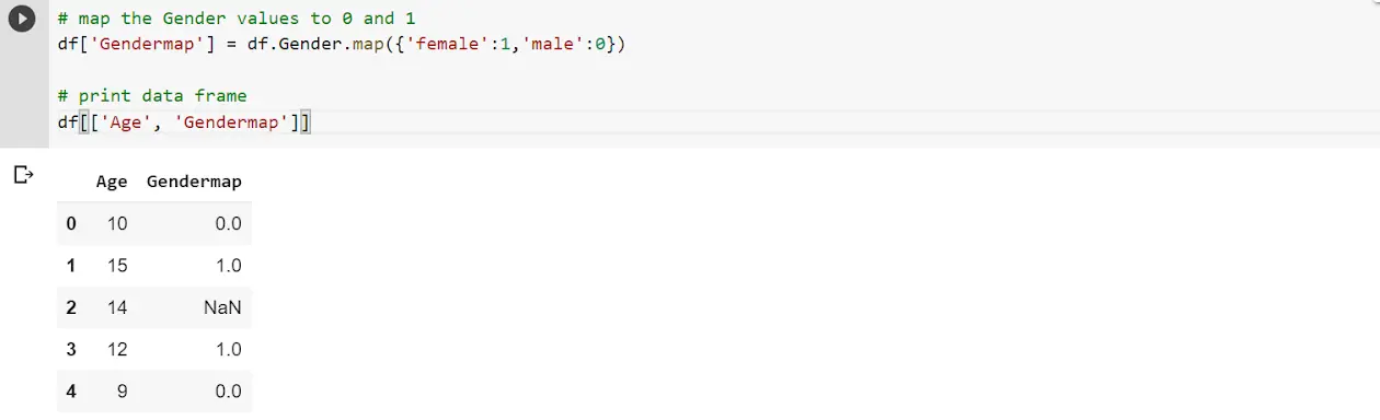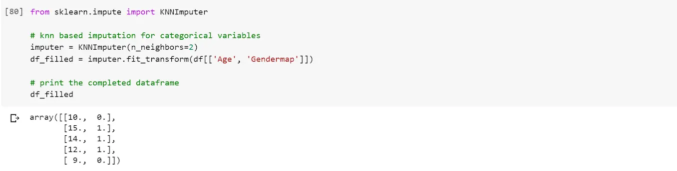 为了填补离散变量中的缺失值,我们必须将离散值编码成数值,因为KNNImputer只对数值变量有效。我们可以使用类别到数值变量的映射来执行此操作。