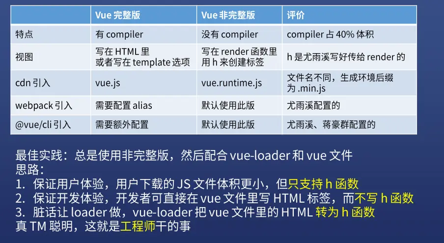 但我们一般建议使用非完整版,因为非完整版(vue.runtime.js)更加独立,你可以自己配置很多东西。