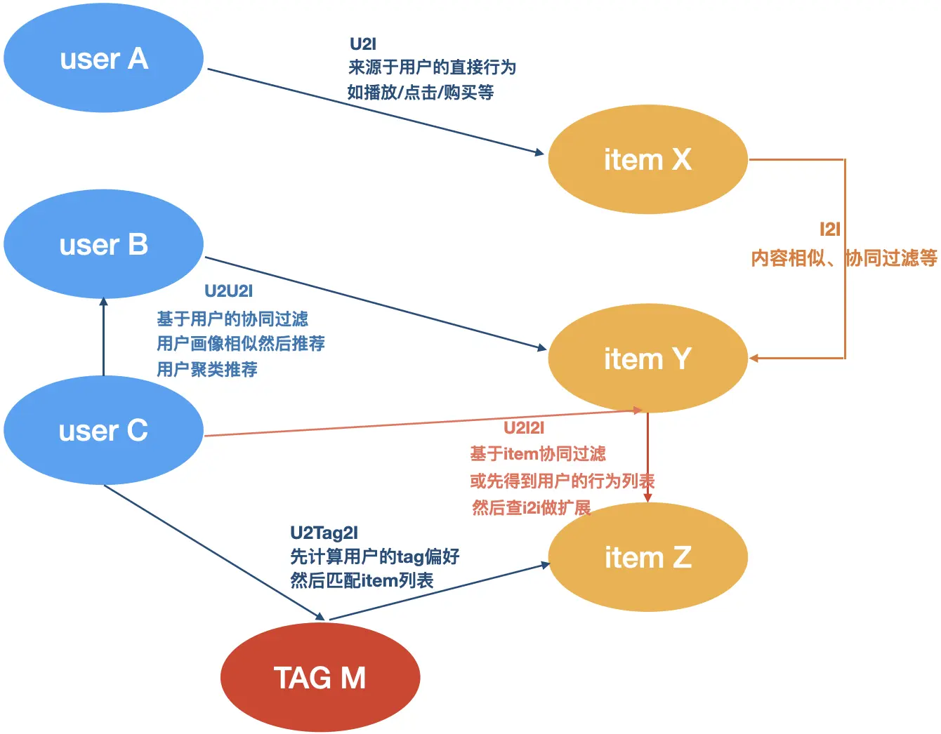 在介绍Embedding召回方法之前先简单介绍一些常见名词概念,如:I2I、U2I、U2U2I、U2I2I、U2TAG2I,如下图所示,其中“2”代表的是下图中的边,“U”与“I”代表的事下图中的节点。