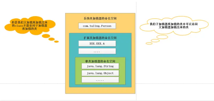 3)子加载器的命名空间中的binary name对应的类中可以访问 父加