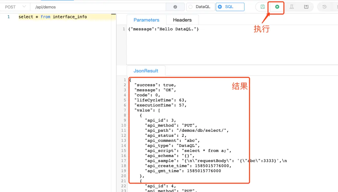 var query = @@sql()<% select * from interface_info%>return query()其中 var query = @@sql()<% ... %> 是用来定义SQL外部代码块,并将这个定义存入 query 变量名中。<% %> 中间的就是 SQL 语句。