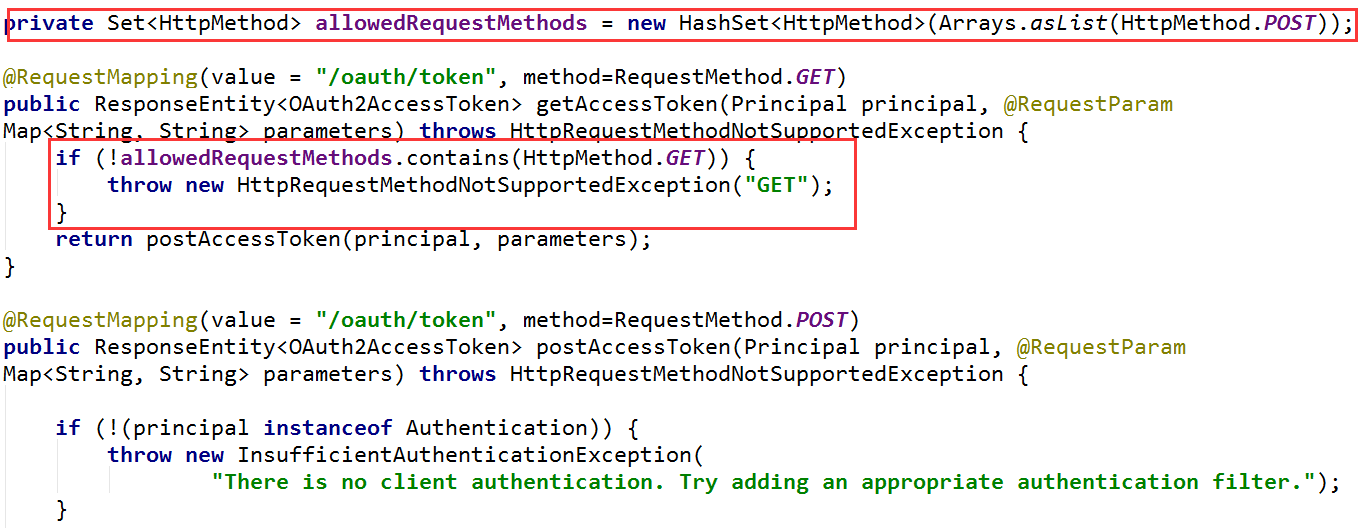 这个类里有两个/oauth/token入口,区分为get方式和post方式,这里注意观察红色部分,使用get方式提交会直接抛出异常,所以这里我们只能用post方式提交。