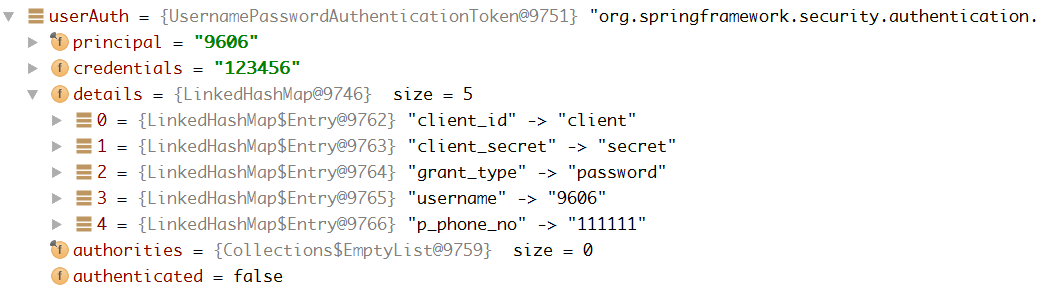 注意到我们添加的角色信息 “ROLE_UNITY“ 已经有了,并且authenticated已经通过为true。