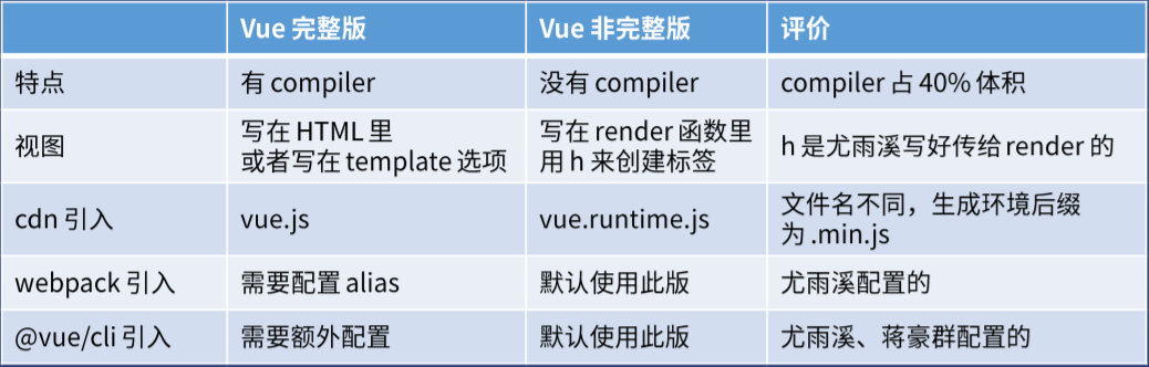 完整版的视图是写在HTML里或template选项的,由于有 compiler(编译器)的存在,完整版运行时:用来创建 Vue 实例、渲染并处理虚拟 DOM 等的代码。基本上就是除去编译器的其它一切。