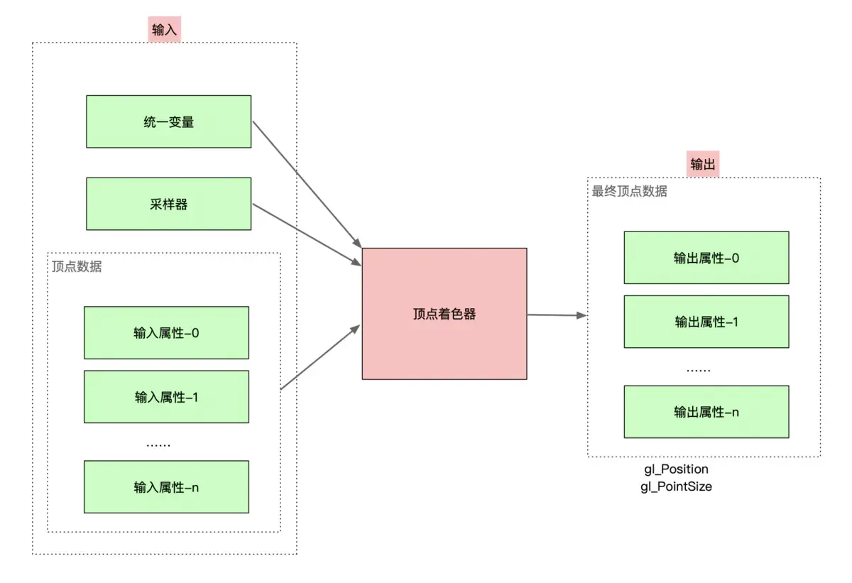 顶点着色器处理顶点的着色器程序,顶点着色器的输入输出如下图所示