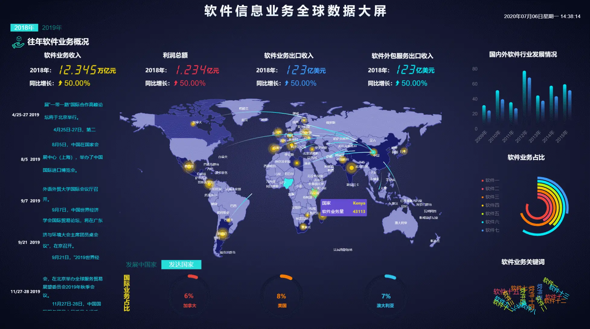 首先要说一下我们制作大屏使用的工具——灯果可视化,是采用最新的可视化大屏图表,默认采用深色背景+亮眼的荧光配色,非常符合浸入式的大屏体验;而且能根据图表类型和数据要求,提供多种动画形式,能够满足不同场景下的业务需求。