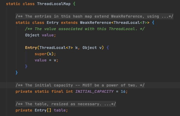 这里threadlocal的原理简单来说,就是Thread持有一个ThreadLocalMap的变量,然后在每一次threadLocal.get()或者threadLocal.set()的时候,回去判断这个threadlocal在当前县城threadlocal里面有没有,如果没有的话那么就创建一个Entry的数据结构,这个数据结构把Threadlocal这个对象包装成一个WeakReference的对象,然后value就设置到Entry的value字段里面。当GC活动的时候会先把弱引用的对象设置成null,然后回收掉这个对象。