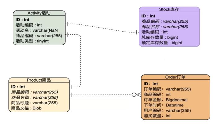 于是我们可以得到秒杀活动中,数据库之间的关系如图所示