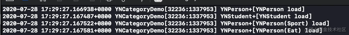 通过源码我们发现是优先调用类的load方法,之后调用分类的load方法。我们添加YNStudent继承YNPresen类,并添加YNStudent+Eat分类,分别重写只+load方法,其他什么都不做,执行结果: