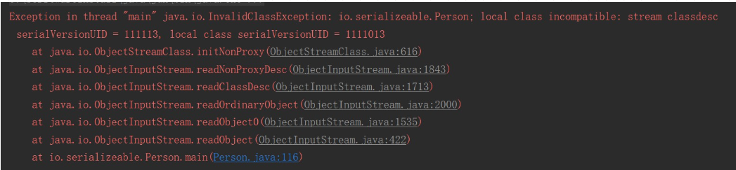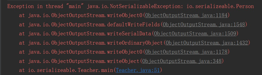 看例子,我们新增一个Teacher类。将Person去掉实现Serializable接口代码。public class Person{ //省略相关属性与方法 } public class Teacher implements Serializable { private String name; private Person person; public Teacher(String name, Person person) { this.name = name; this.person = person; } public static void main(String[] args) throws Exception { try (ObjectOutputStream oos = new ObjectOutputStream(new FileOutputStream("teacher.txt"))) { Person person = new Person("路飞", 20); Teacher teacher = new Teacher("雷利", person); oos.writeObject(teacher); } } } 我们看到程序直接报错,因为Person类的对象是不可序列化的,这导致了Teacher的对象不可序列化