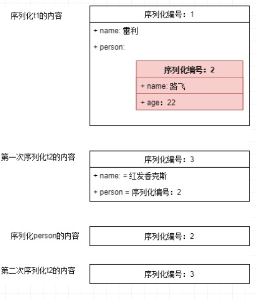 - 同一对象序列化多次,只有第一次序列化为二进制流,以后都只是保存序列化编号,不会重复序列化