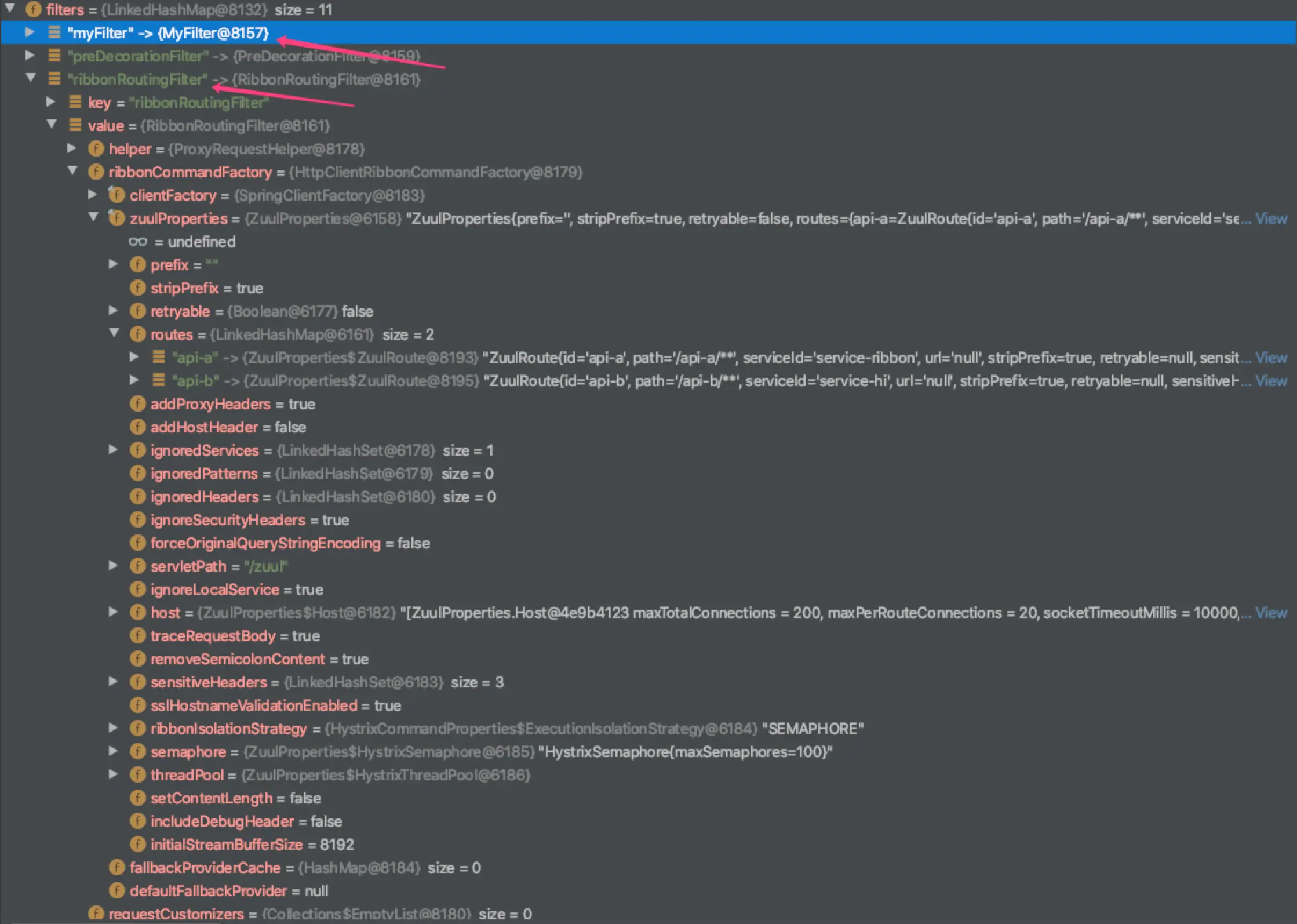 从ZuulServlet的Route()方法开始,同样的步骤,只是过滤器类型为"Route"和filter为RibbonRoutingFilter。另外两个是会跳过,可配置