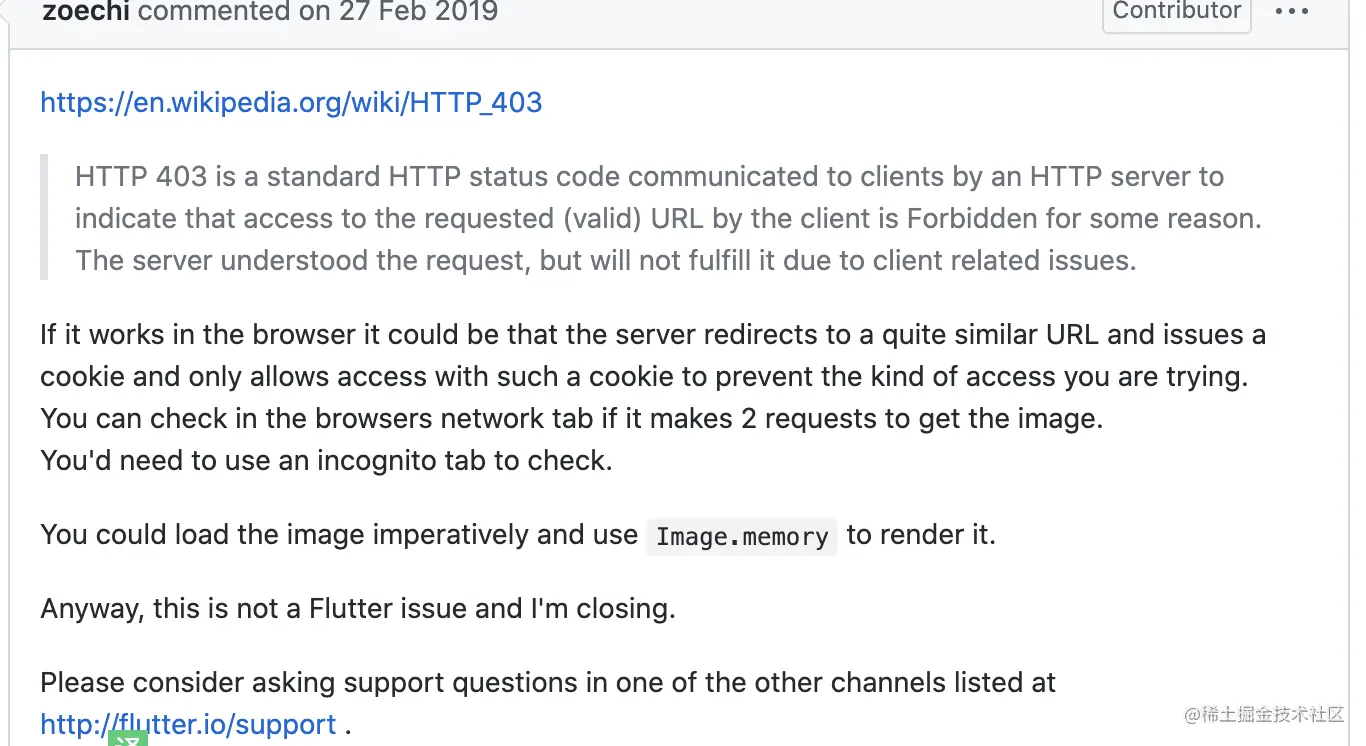 Image.network加载http://前缀图片时会报错无法获取图片资源。 开始以为Flutter的Image默认不支持http图片下载看了这个issue才知道可能这张图片地址并非原图片地址中间可能存在二次请求所以会出现403错误。