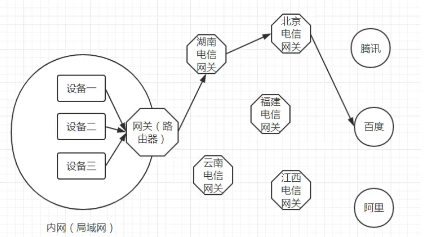 如果使用校园网,首先需要先通过校园网的路由器把我们的内网ip转为校园网的外网ip。然后通过这个外网ip先连接上湖南电信的网关,最后在连接上百度的网关。百度把你请求的信息回传到你的校园网网关,校园网网关再把信息传给你(整个网络呈网状结构,它会自动找到一条通往百度的路径——基于深度优先搜索或者广度优先搜索)。