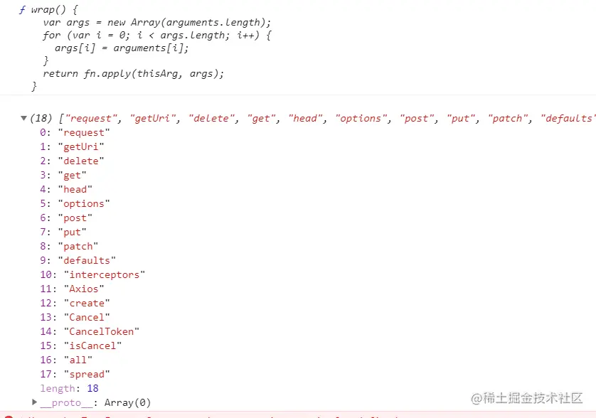 fn,thisArg是什么后面调试看代码的时候再说,现在能明确的是使用 aixos 时,import 导入的,实际上是一个函数,同时这个函数(Object),有18个属性(JS中,可以给函数添加属性,添加的属性可通过 Object.keys() 方法获得)