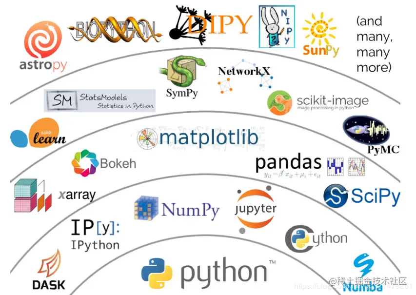 NumPy,Numerical Python的简称,NumPy与各包之间的关系,见下图;NumPy的数组(N维数组对象,即numpy.ndarray)是多数pyhton科学计算包的构建基础;