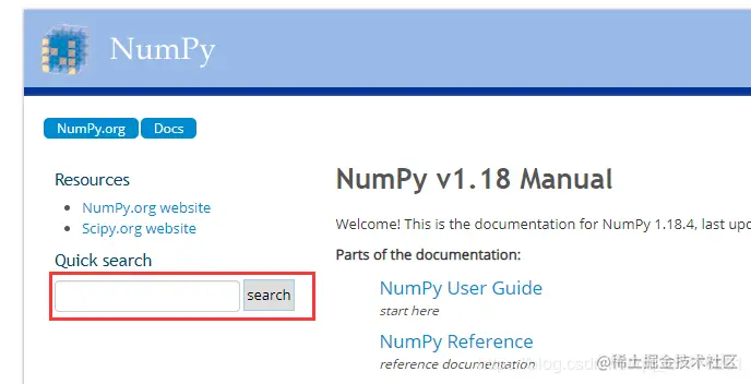 关于numpy中任何函数的使用方法,点击网址:numpy.org/doc/stable/,搜索即可见详细文档:Python中导入numpy模块,Python社区,习惯将numpy模块的名称简写为np,导入方式如下: