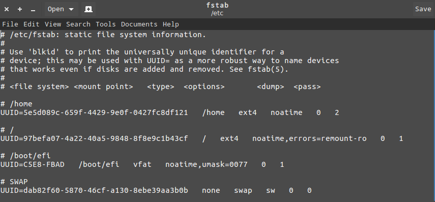 sudo gedit /etc/fstab