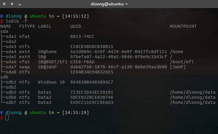 /home/dlonng/data1:要挂载到的目录,记得在挂载前新建这个目录!ntfs:挂载硬盘的文件类型,我的是 ntfsdefault:默认自动挂载utf8:挂载字符编码uid,gid:挂载这个硬盘的用户 id 和组 id,通过id username命令查看