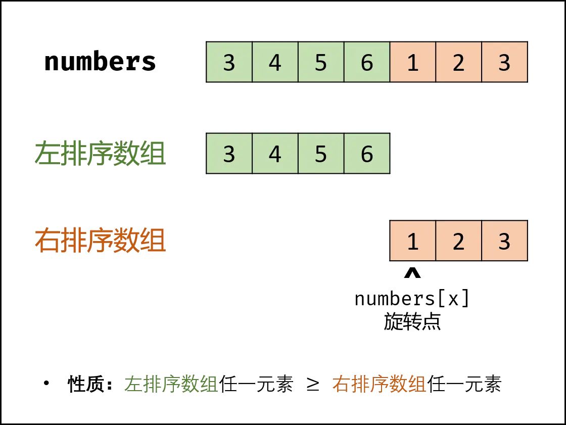 当 numbers[m] > numbers[j]时: m 一定在 左排序数组 中,即旋转点 x 一定在 [m + 1, j]闭区间内,因此执行 i = m + 1;