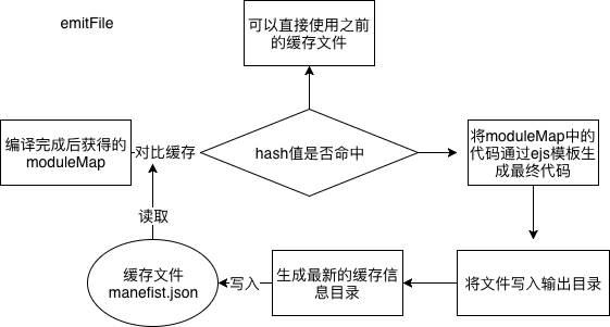 在这一步中我们根据文件内容生成的 Md5Hash 去对比之前的缓存来加快打包速度,细心的同学会发现 Webpack 每次打包都会生成一个缓存文件 manifest.json,形如