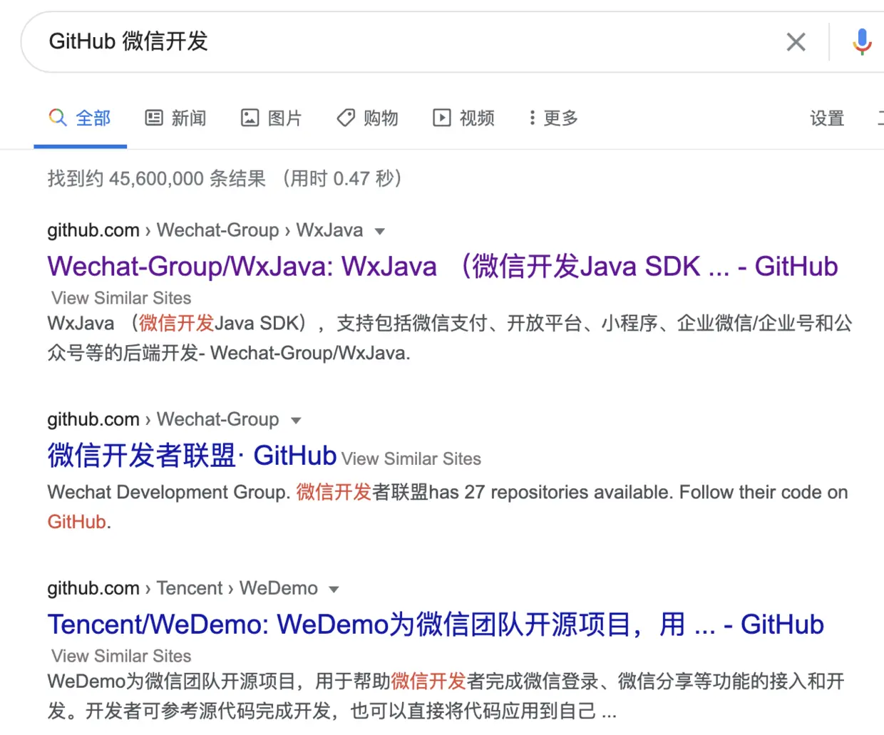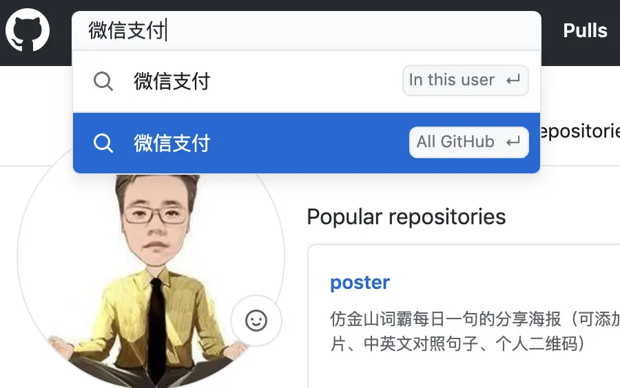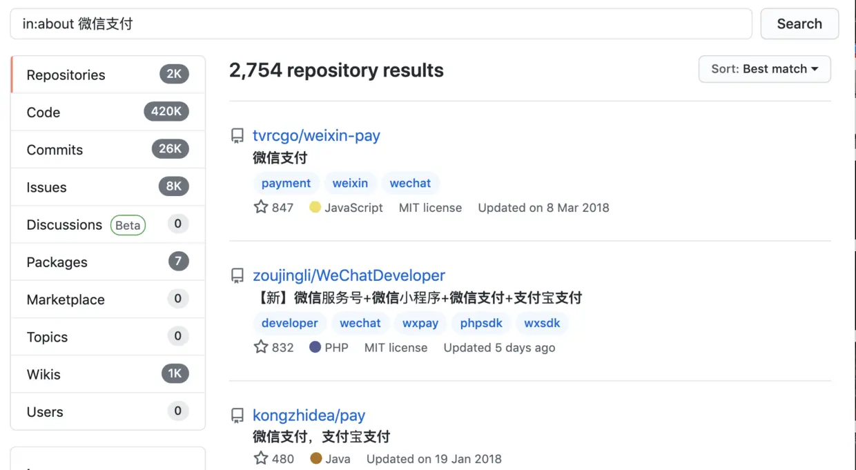 GitHub 主页上会有一个搜索框,直接在里面搜项目的关键字就行了,比如说微信支付这个关键字。