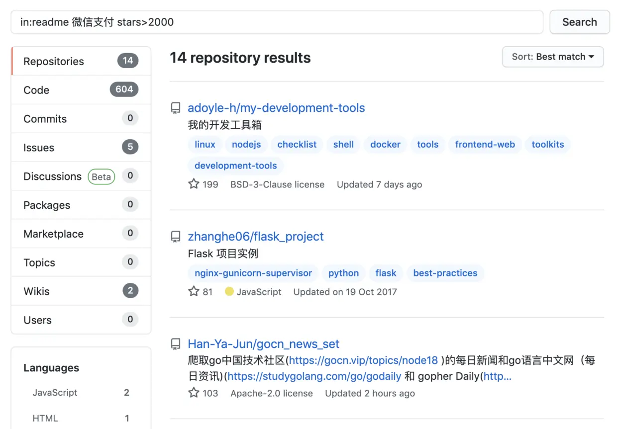 一个仓库之所以优质,就在于它的 star 数是否足够多,因此可以在后面加上 stars>2000,这样过滤后的结果就少了很多。