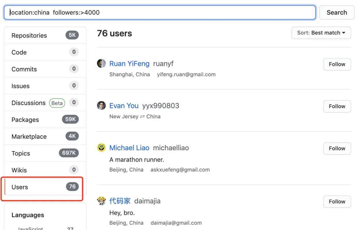 比如我搜 location:china followers:>4000,注意左侧选中「Users」,排名比较靠前的两位是阮一峰和尤雨溪大佬。