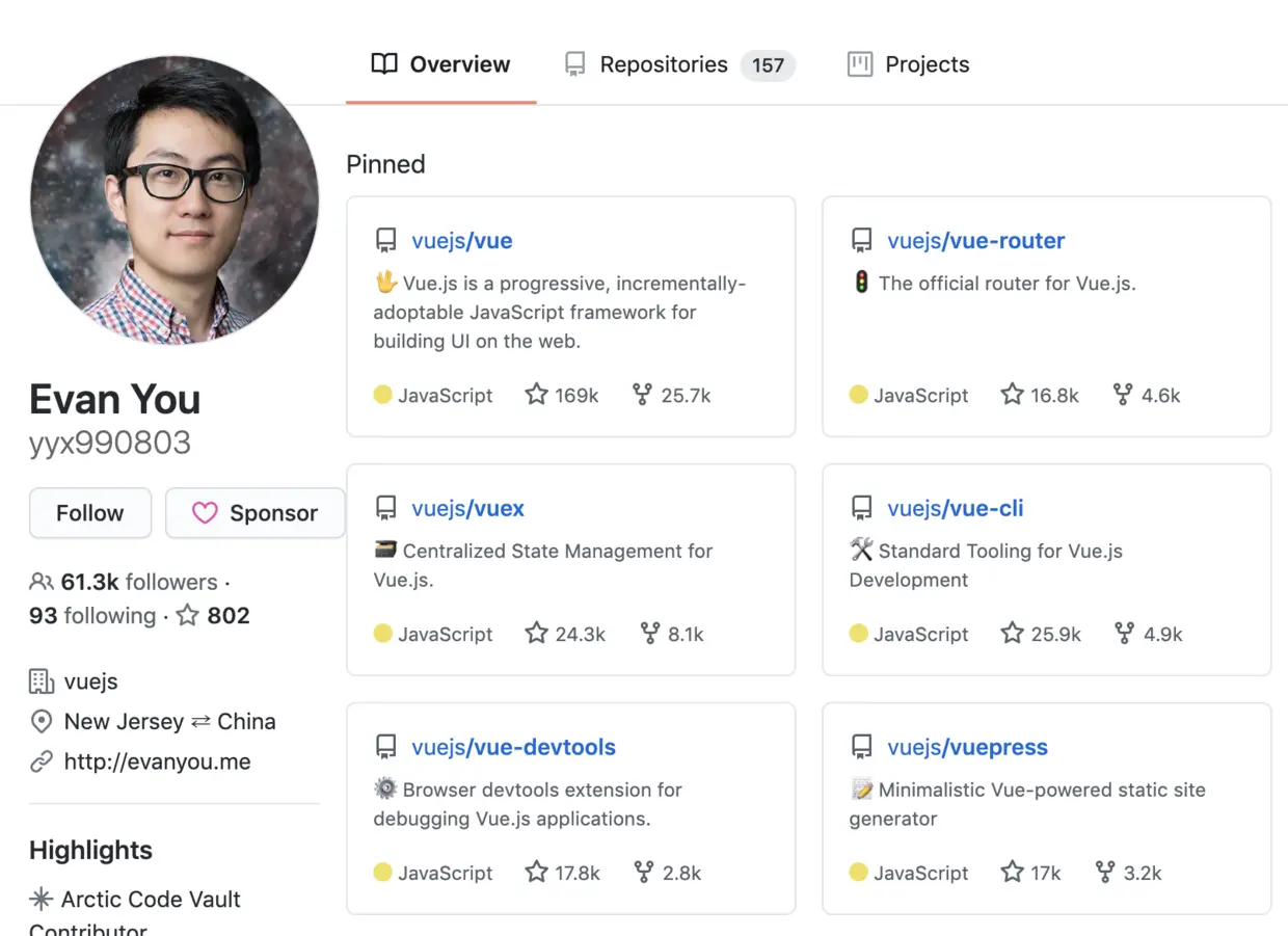 查看一下尤雨溪大佬的主页,头像真的非常清秀帅气,我第一印象知道想到了谁吗?徐志摩。前端框架 Vue.js 的作者, 真的非常牛逼了。