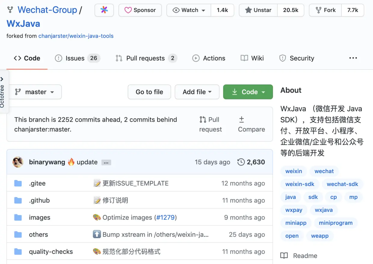 star 数高达 20k,可以说非常优质的项目了。我在做商城的时候就用的这个,微信开发的 Java SDK,支持包括微信支付、开放平台、公众号、企业微信/企业号、小程序等微信功能的后端开发。