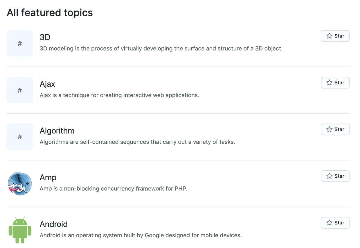 GitHub Topics 展示了最新和最流行的讨论主题,在这里不仅能够看到开源项目,还能看到更多非开发技术的讨论主题。地址如下: