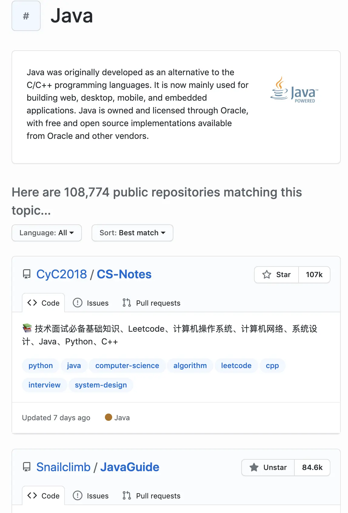 点击标签就可以跳转到 Java 的主题了,排名第二的竟然是我的好朋友 guide 哥的仓库,star 已经 84k+ 了,牛逼牛逼。