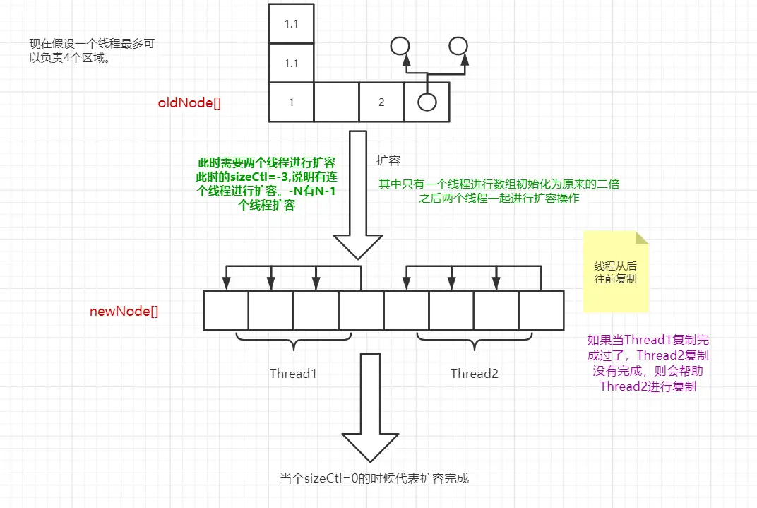 多线程扩容,首先获取到当前机器的CPU核数,然后给每一个线程最少16个数组位的扩容责任,当有线程将数组位扩容完成以后,就将这个数组位的头节点设置为fwd节点(hash值为-1即MOVED)