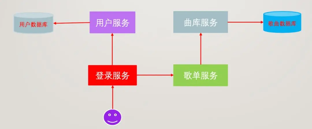 还是举一个例子:比如我们用 QQ 音乐听歌,感兴趣的歌曲会做成歌单,当手机端用户先用手机号 / 邮箱 / 第三方账号等进行登陆,登录之后进入的自己主页,拉取自己喜欢的歌曲歌单,最后点击播放,这个过程就涉及到多个服务的相互调用,如图: