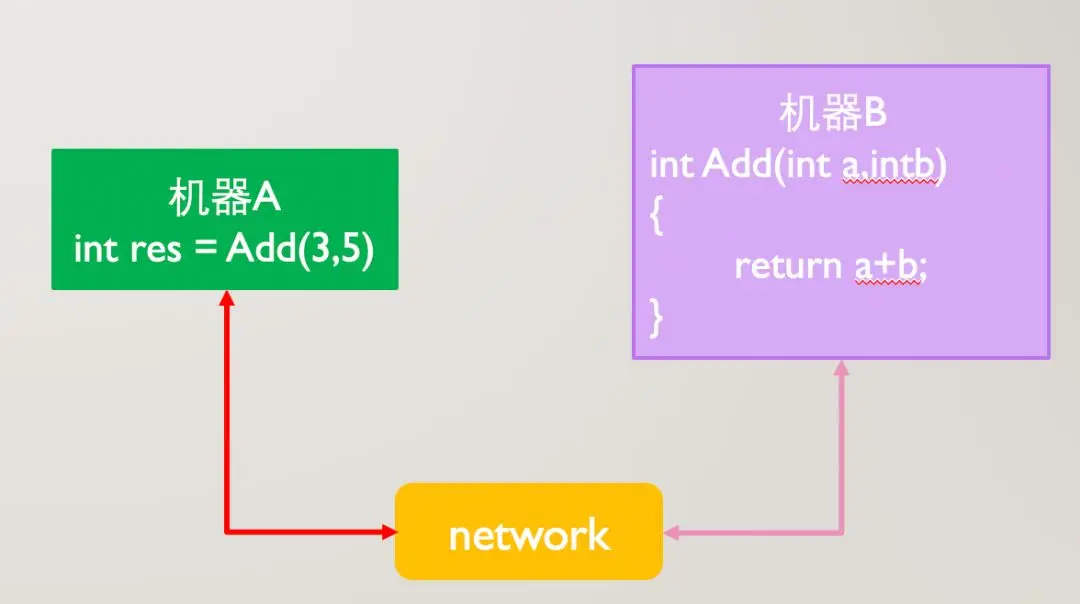 这样服务 A 需要通过网络传输来告诉服务 B,它想要 add 函数,传入的两个参数分别是 3 和 5,返回的结果放在 result 里面就可以。