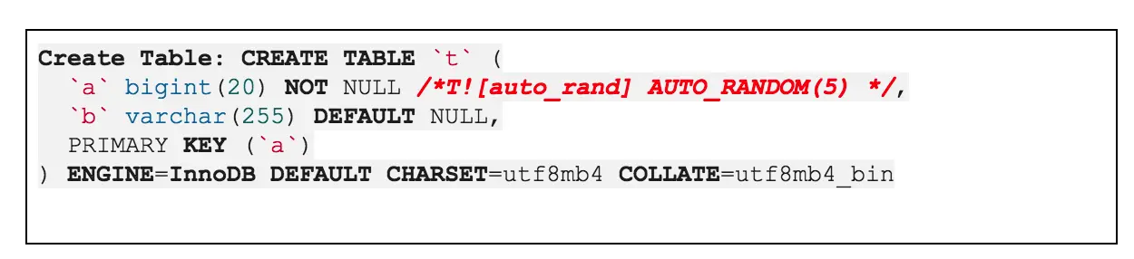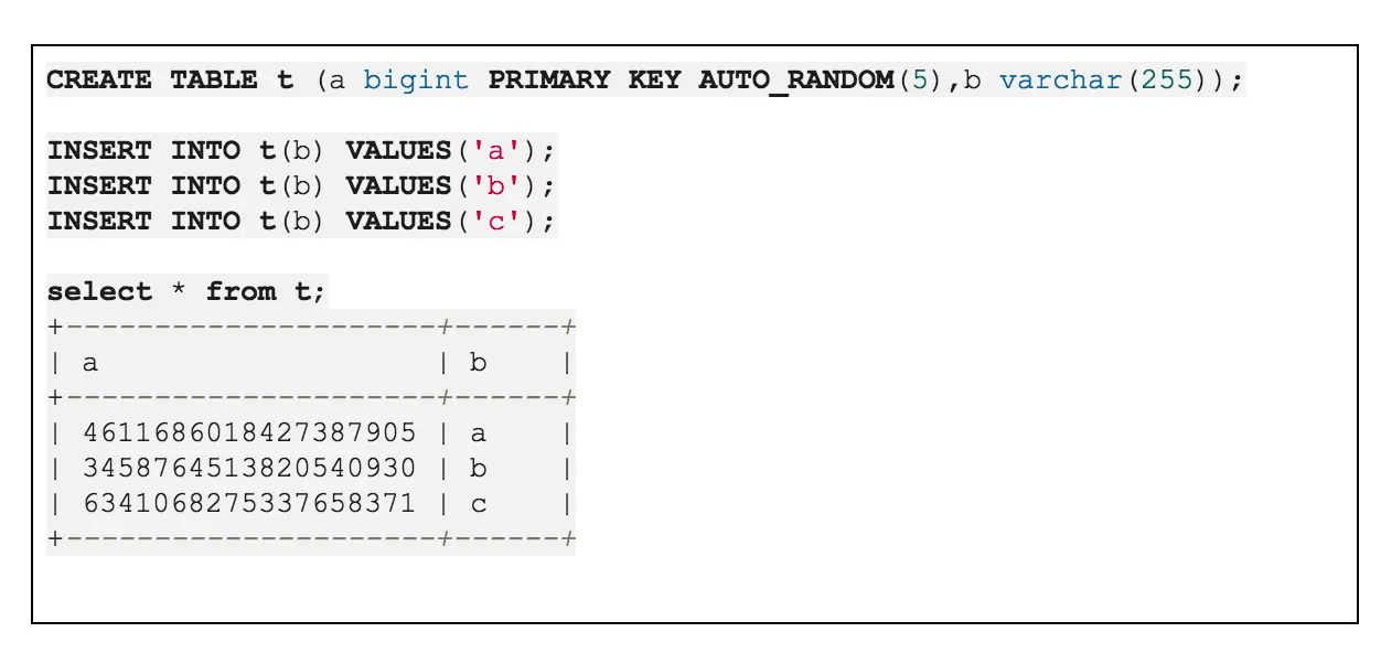 当然,AutoRandom 和 SHARD_ROW_ID_BITS 一样,可以配合 PRE_SPLIT_REGIONS 语法共同使用,也可以使用 1707676 获取其值。