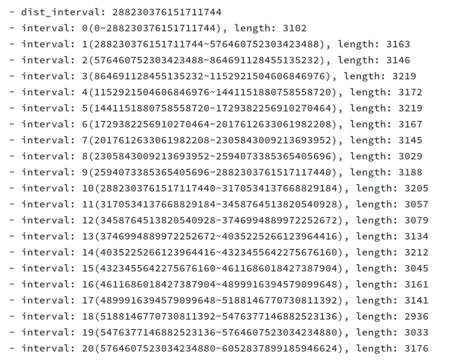 上图中 dist_interval 表示分段的基准间隔, interval 表示不同分段范围,length 表示 AutoRandom 的结果命中在该范围中的次数。