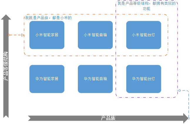 简单来讲,就是下面这张图:小米家的相关的智能家居产品组成了一个产品族(智能音箱+智能台灯+其他),华为的组成另外一个产品族,而两家都拥有各自的台灯,就是产品等级结构。