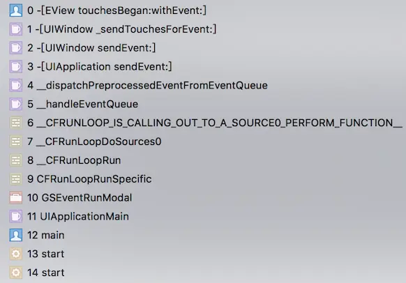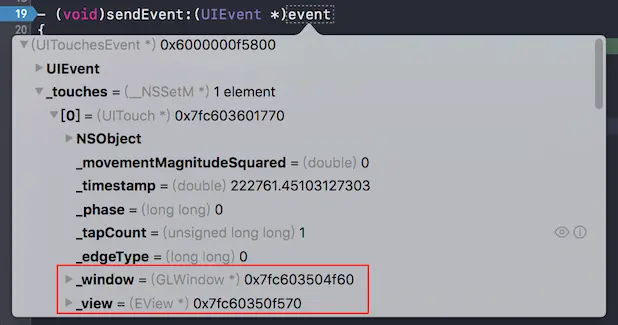 @end有一个_touchDelay变量,大概是用来控制延迟事件发送的。另外,方法列表里有个 sendTouchesShouldBeginForDelayedTouches: 方法,听名字似乎是在一段时间延迟后向响应链传递事件用的。为一探究竟,我创建了一个类hook了这个方法: