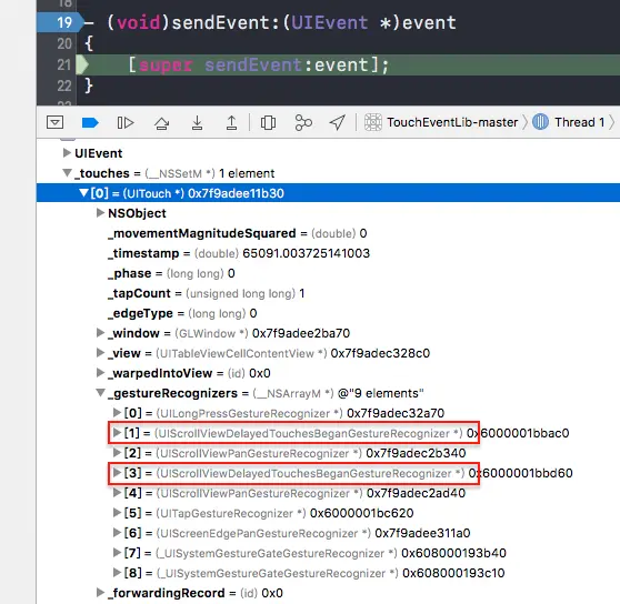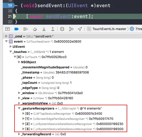Window的 sendEvent: 打个断点查看event上的touch对象维护的手势识别器数组: