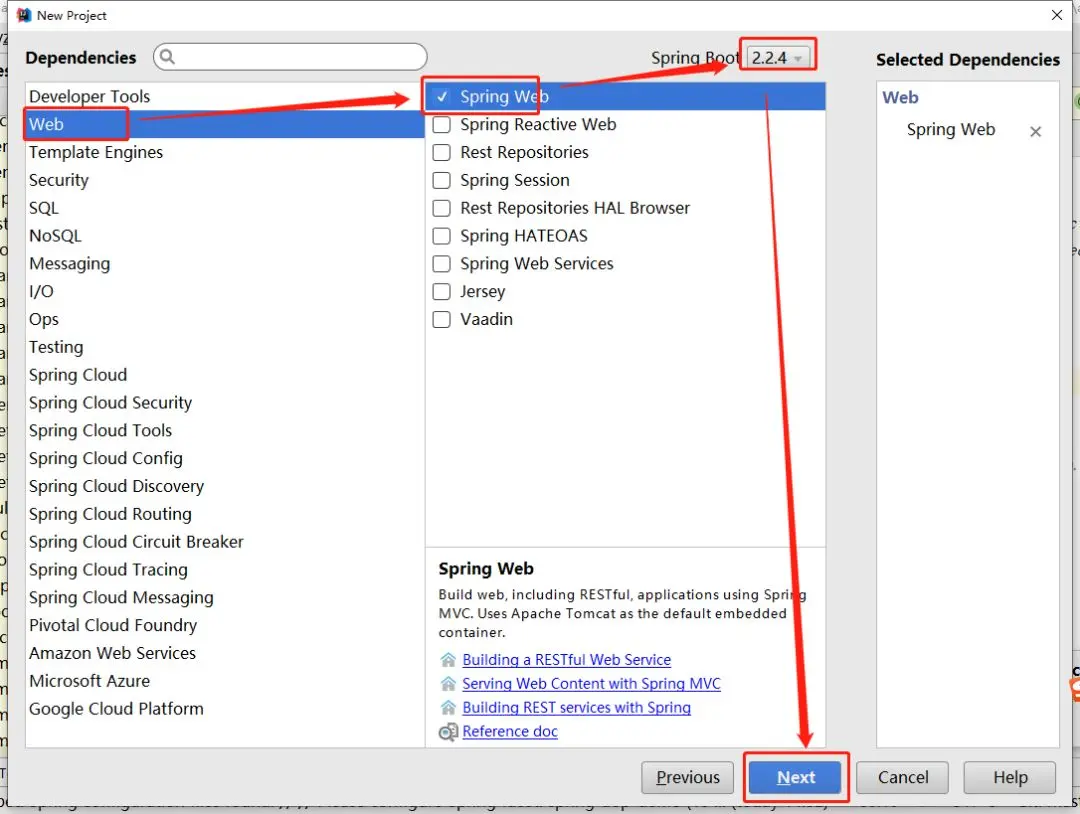 选择Web->Spring Web->Spring Boot(2.24)->Next,如下图: