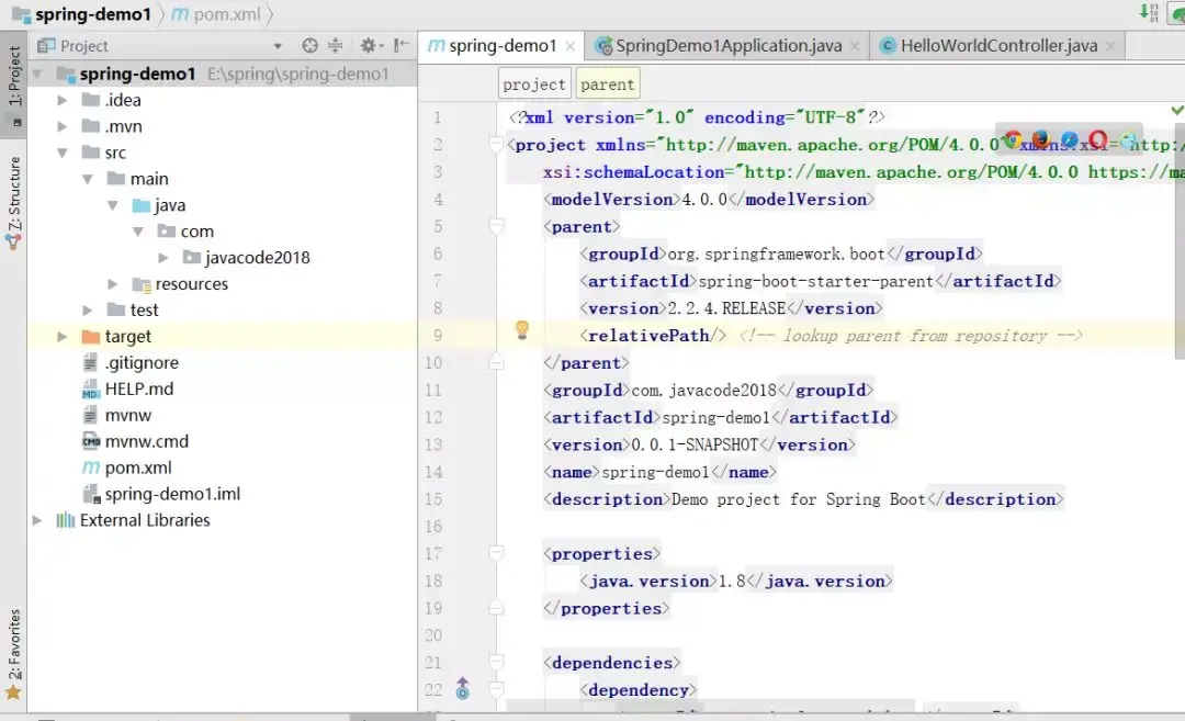注意项目中有一个自动生成的类:com.javacode2018.SpringDemo1Application,这个类包含了main方法,说明是可以运行的,我们运行一下,控制台输出: