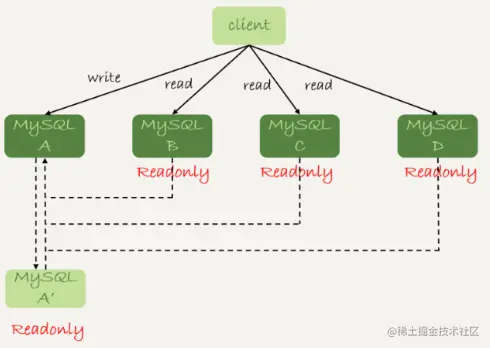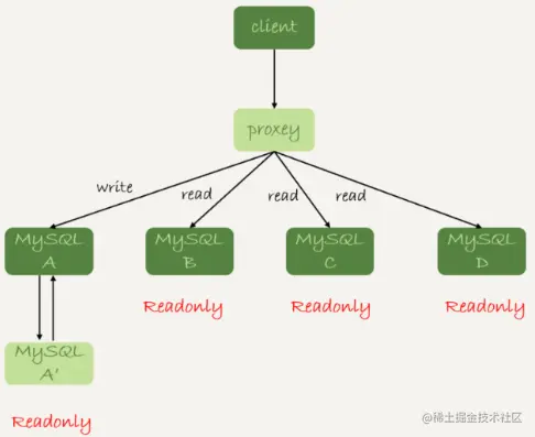 还有一种架构是,在 MySQL 和客户端之间有一个中间代理层 proxy,客户端只连接proxy, 由 proxy 根据请求类型和上下文决定请求的分发路由。